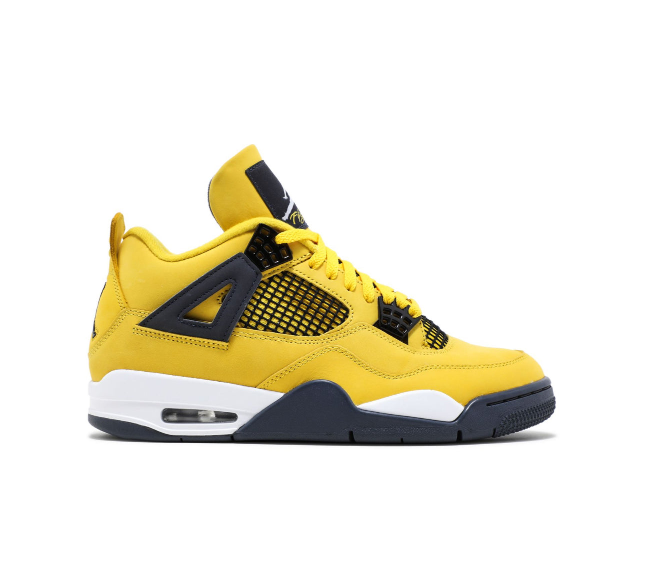 The Air Jordan 4 Retro ‘Lightning’ features a vibrant Tour Yellow nubuck upper with black mesh accents, dark grey wings, and white midsole housing a visible Air unit. Originally released in 2006 and reissued in 2021, it blends bold style with classic AJ4 heritage.