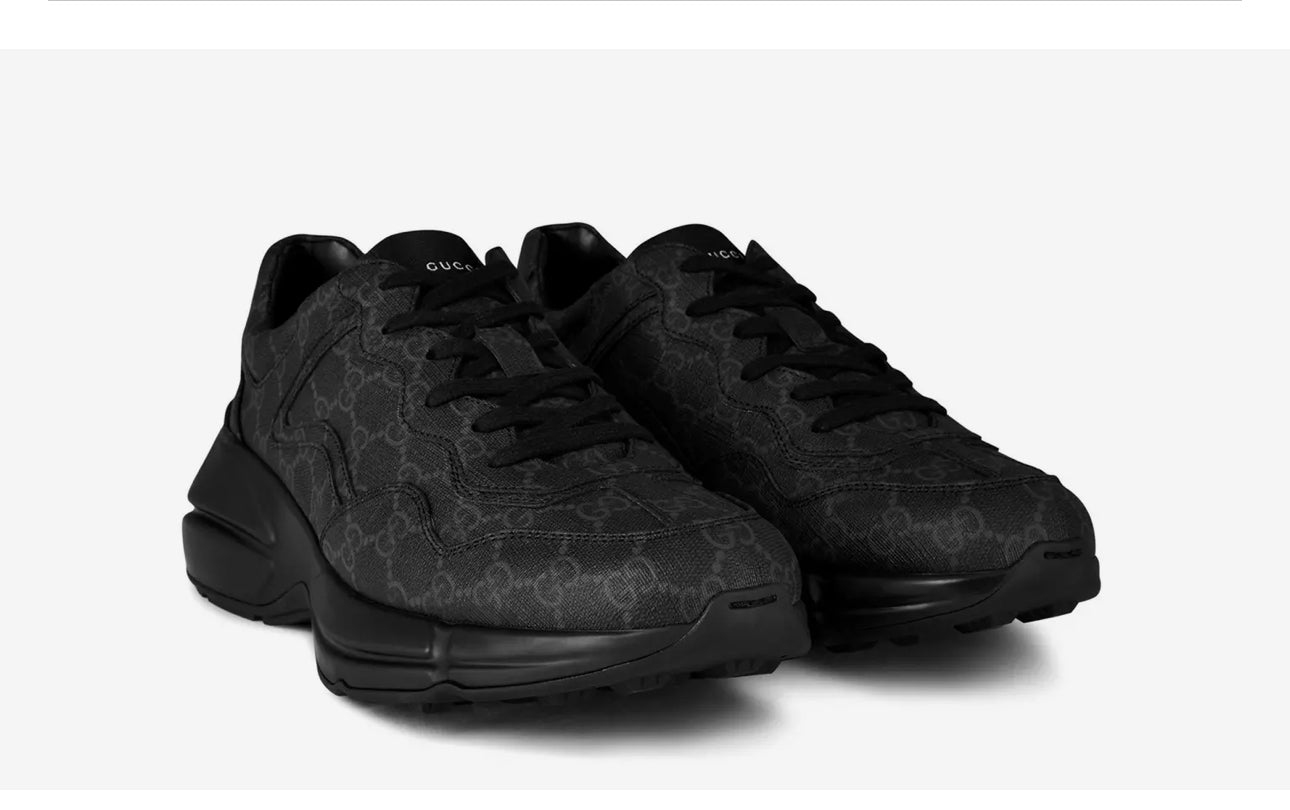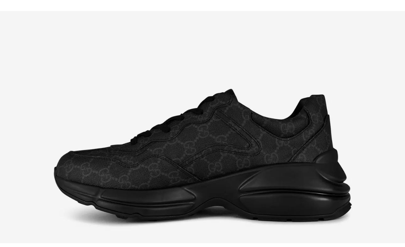 Gucci Rhyton Black GG Supreme Canvas – A bold, statement-making sneaker featuring the iconic GG Supreme monogram on durable black canvas. It boasts a chunky, retro-inspired rubber sole, padded leather lining, and lace-up closure. Finished with leather trim, an embossed interlocking-G logo at the heel, and extra laces and dust bag included. Crafted in Italy, it’s the perfect blend of high-fashion flair and street