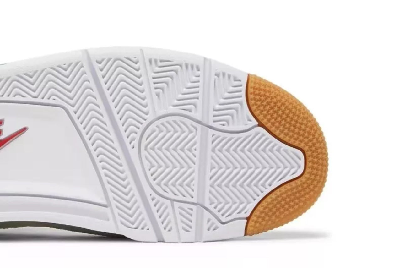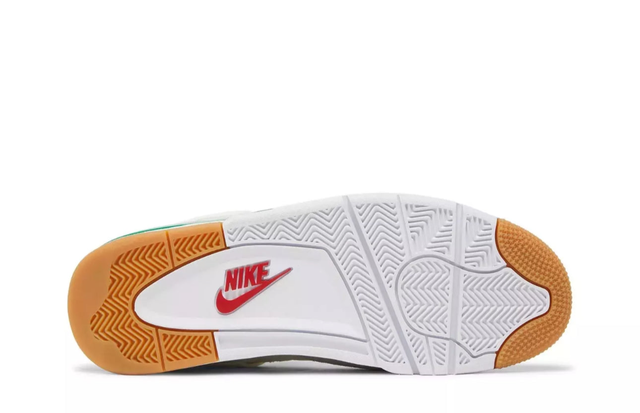 Air Jordan 4 Retro SB “Pine Green” – A skate-ready rework of the iconic AJ4, released March 2023. Crafted from a sail-white leather upper, it features grey suede mudguards, bold Pine Green accents on the eyelets, midsole, and heel tab—branded “Nike SB”—and a discreet crimson Jumpman on the tongue. It rides on a gum rubber outsole built for superior grip, with visible Air cushioning and a flexible, deconstructed forefoot for board feel and performance
